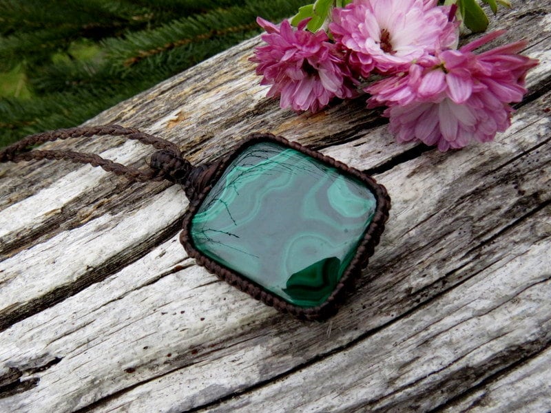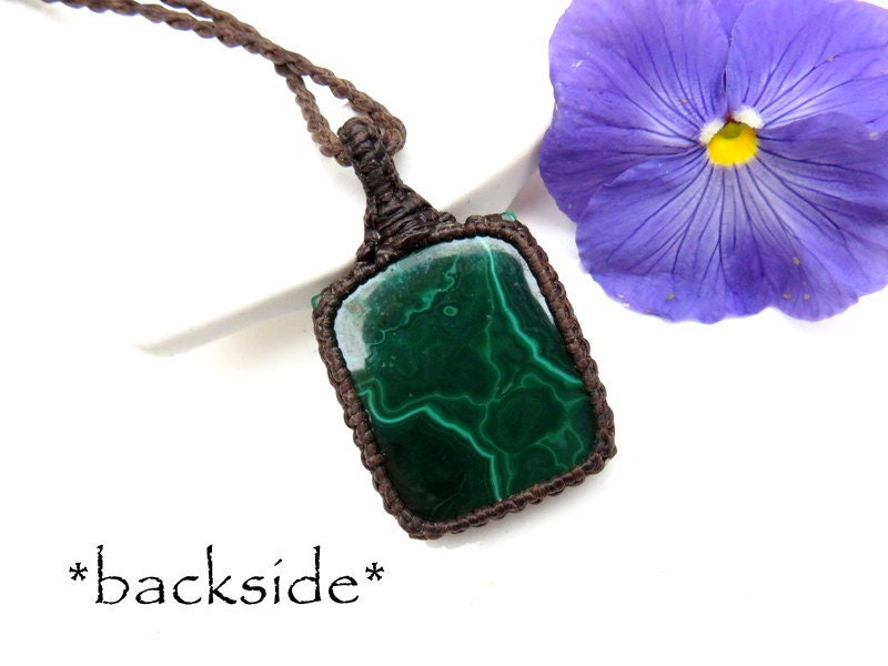 Beautiful Malachite macrame necklace - one of the most ancient gems - Its distinctive concentric layers, "eyes," banding and patterns- make it truly one of the most unique gemstones - This one is a vibrant green with very nice patterns - an excellent gemstone to support the heart chakra!