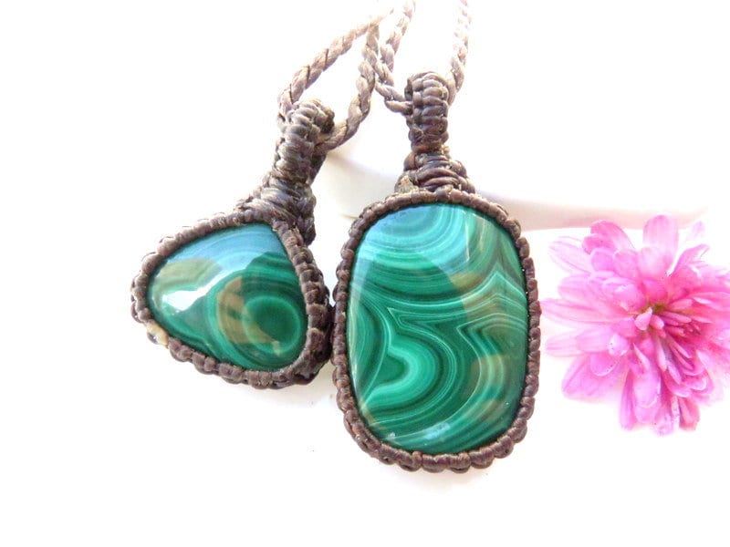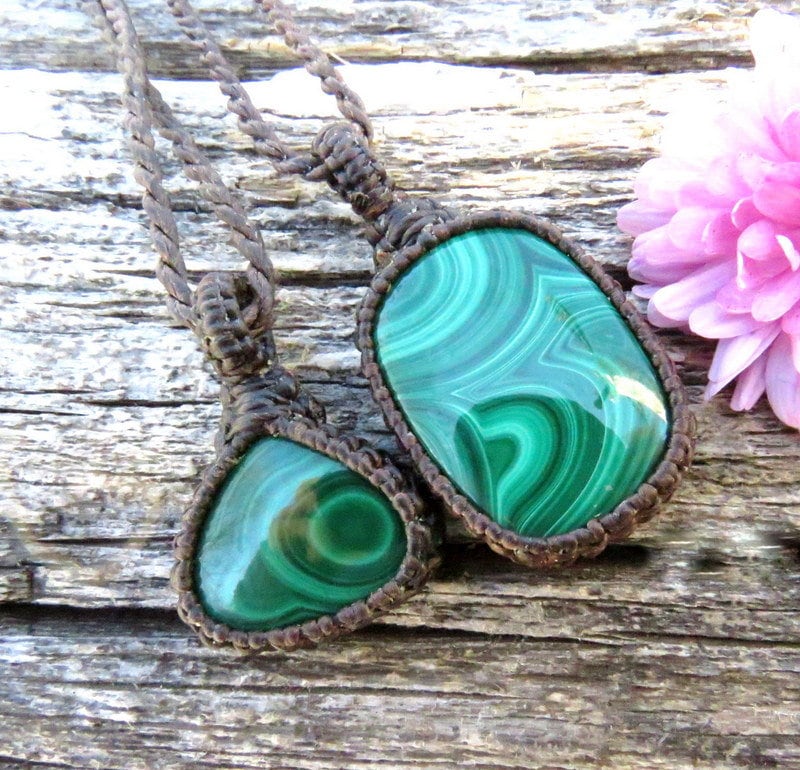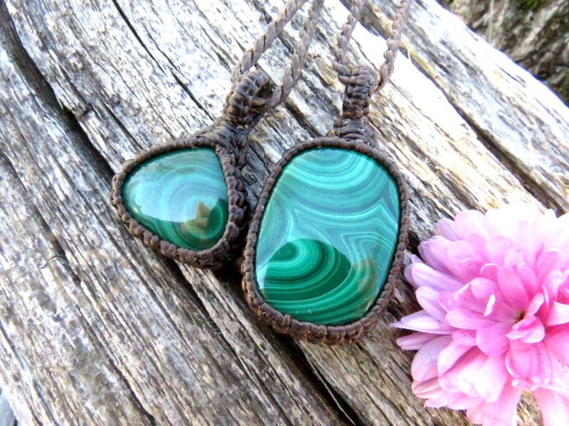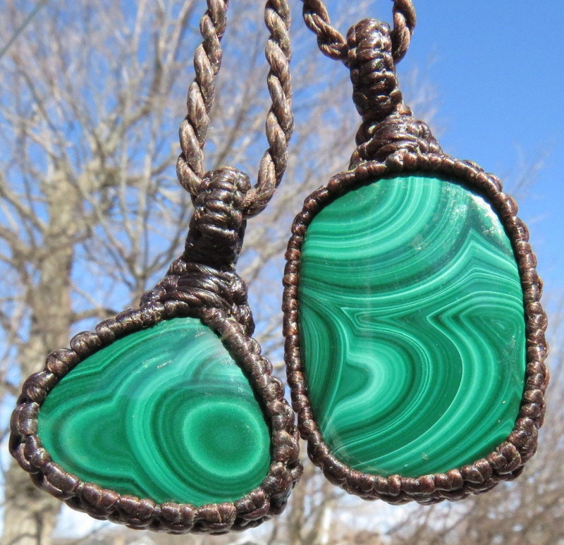 Beautiful Malachite macrame necklace set - one of the most ancient gems - Its distinctive concentric layers, "eyes," swirls and waves make it truly one of the most unique gemstones - This listing is for TWO Malachite necklaces that can be worn layered together or worn separately. Both are a vibrant green with gorgeous patterns and banding - an excellent gemstone to support the heart chakra! *In the photos, we are showing the set with the 18 inch and 22 inch cord lengths - if you wish for different cord lengths, please indicate which lengths in the 'note to seller' when checking out.
