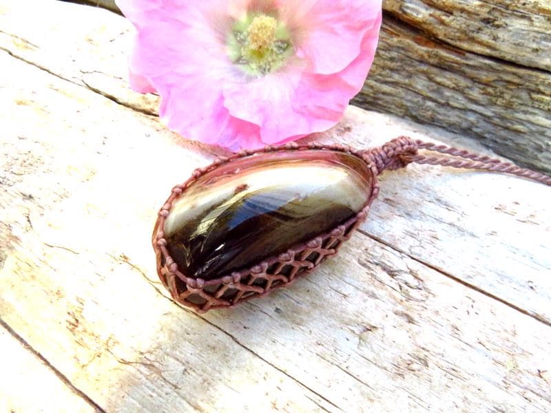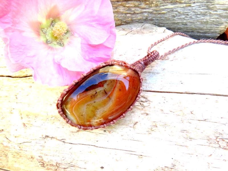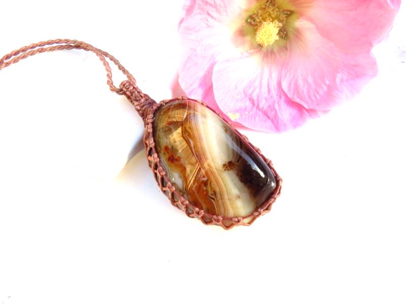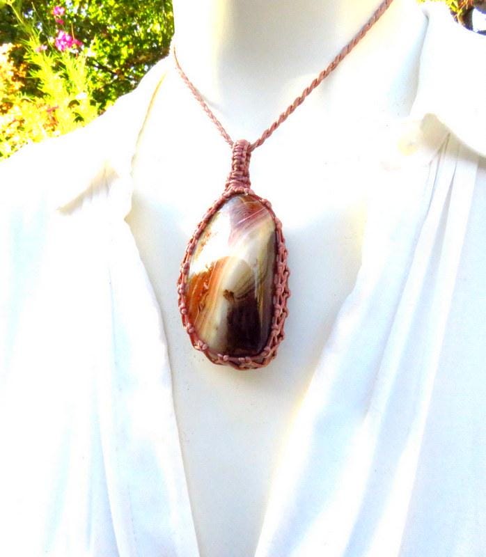 Gorgeous Sardonyx macrame Necklace - Very unique piece distinctive banding in beautiful black, brown and reddish orange with mesmerizing patterns!