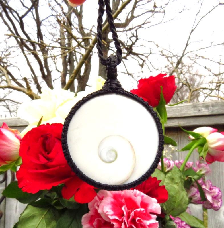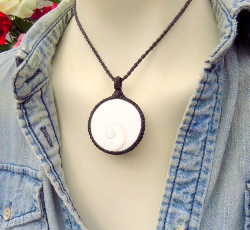 Big and beautiful Shiva Eye Shell macrame necklace - brilliant, pure white with a lovely brown spiral pattern. A Shiva eye shell, also known as a Shiva's eye or Pacific cat's eye, is a stunning and unique natural gemstone. It is the protective operculum, or 'trapdoor,' of the Turban snail (Turbo smaragdus) found in the Indian Ocean, particularly in the shallow coastal waters of Thailand, Indonesia, and Australia. The Shiva eye shell is renowned for its distinctive appearance, characterized by a mesmerizing spiral pattern on its surface which resembles an enigmatic and alluring eye. A very unique gemstone for your collection !