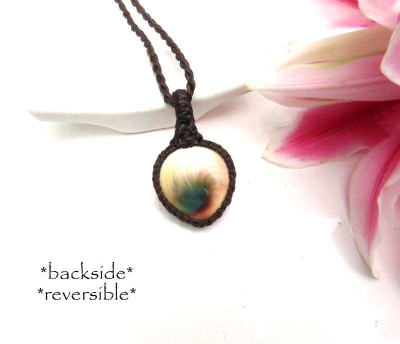 Materials: shell, shiva eye, seashell, turban shell, cabochon, waxed cord.