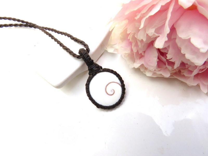 Sweet Shiva Eye Shell macrame necklace - brilliant, pure white with a lovely spiral pattern. The 'shiva eye' belongs to a sea animal called the 'turban shell - the turban shell has a protective 'door' which closes when danger is near...This is the 'shiva eye' - Symbolizes the 'third eye of shiva' and watches over the one who wears it ~ : ) Reversible! You will receive the exact piece in photos #1-6 and the video.