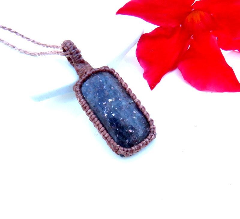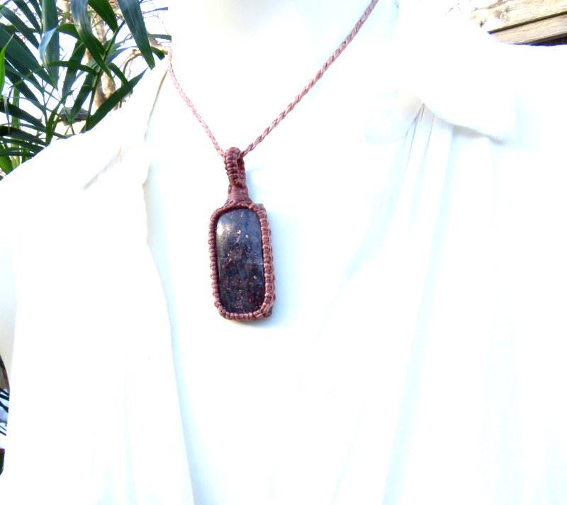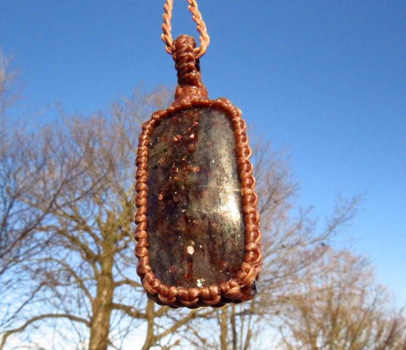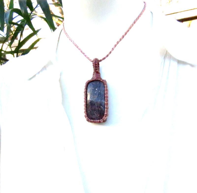Rare Iolite Sunstone macramé necklace - Beautiful deep purple Iolite ( also known as 'water sapphire ' ) and sparkling Sunstone form together to make ' Iolite Sunstone ' - reminiscent of the sun hitting water - It is a new stone but not easy to find and is featured in the famous 'Book of Stones ' by Robert Simmons and Naisha Ahsian. **Please note that this gemstone has an internal fracture line - however, the gemstone is stable. Many gemstones can have fracture lines - but they are not 'broken' or 'cracked. However, do not purchase this piece if you are looking for the 'perfect' stone without imperfections🌹