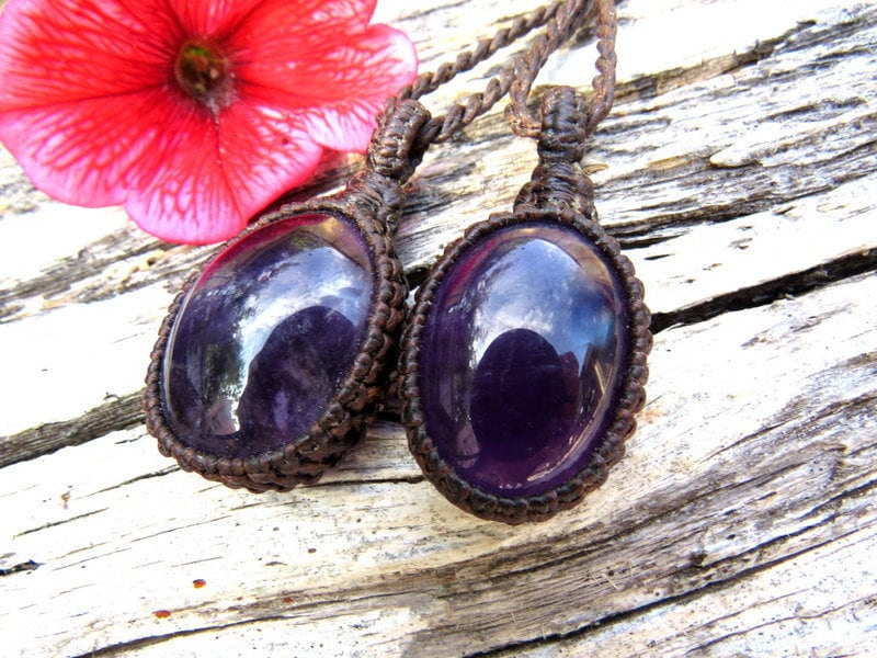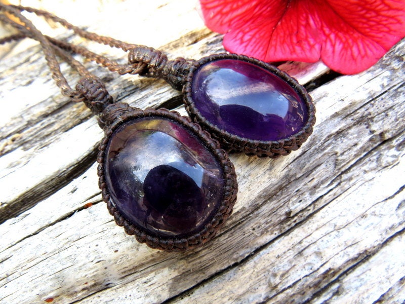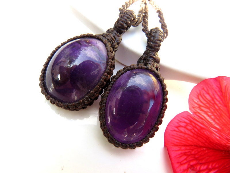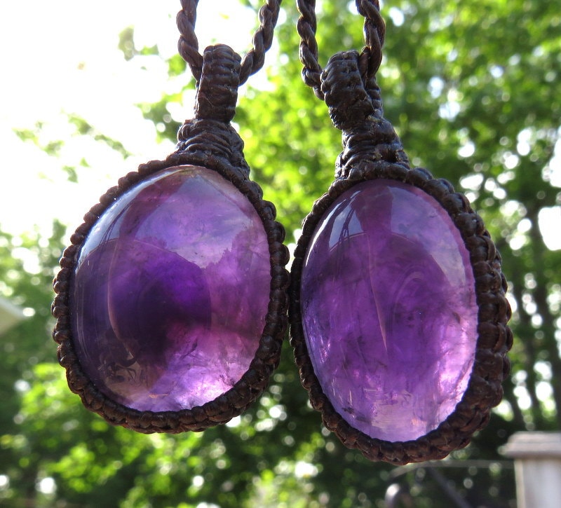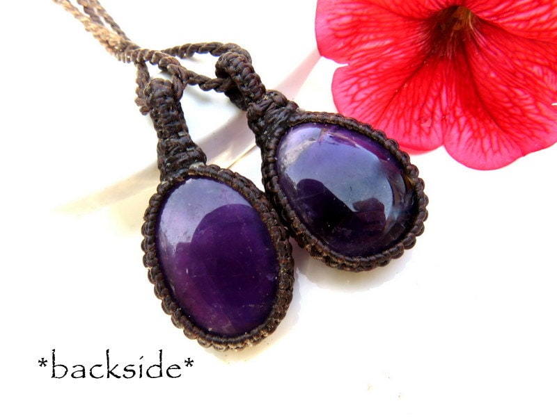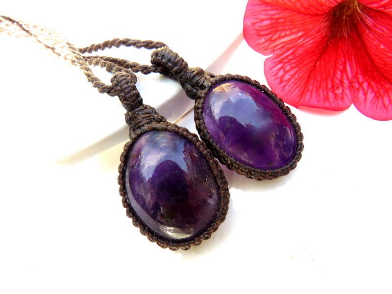 This listing is for TWO lovely 💜Amethyst💜 macrame necklaces - deep, glorious purple - superb quality ! These pairs can be worn stacked/layered together or worn separately - also a lovely idea for best friends and soul-mates - and also a great size for kids! *You will receive BOTH (2) pieces with the cord length of your choosing for each (if you wish for different lengths, please indicate in the 'notes to seller' box in your cart or send us a message! ) *Minor, natural imperfections. *In the listing photos, we are showing the set with the 18 inch and 22 inch cords.