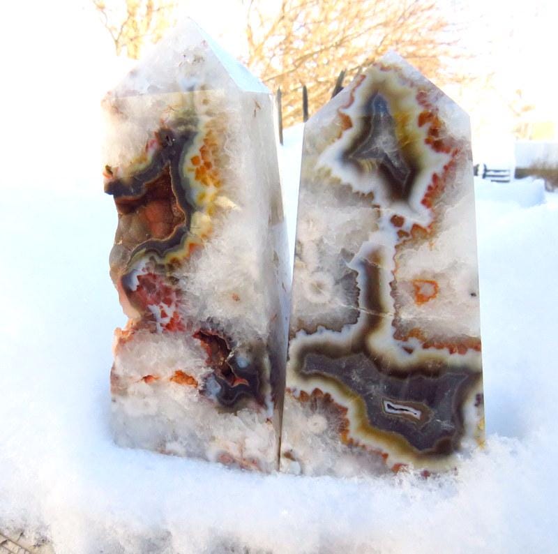Gorgeous Black Flower Agate Towers - From Madagascar - Its gorgeous plumes resemble cherry flower blossoms✨ Both of these towers are exceptional with their unique colors, banding and patterns! Tower #1 includes intriguing druzy caverns ! *Note: Agate #1 has Sold