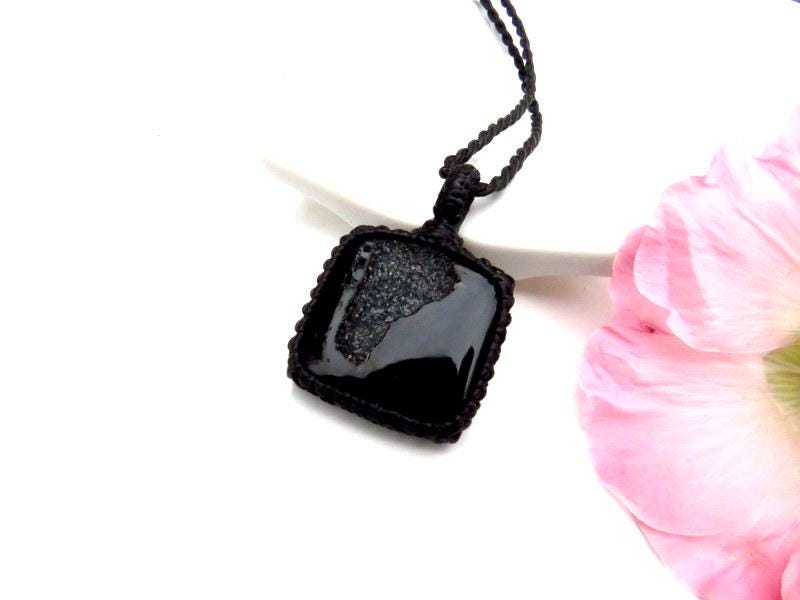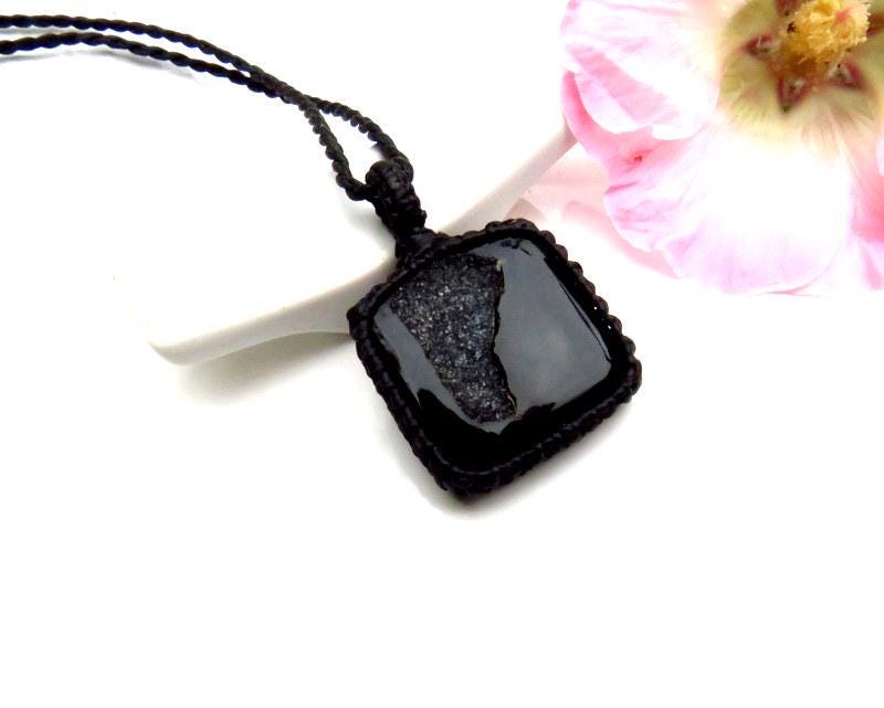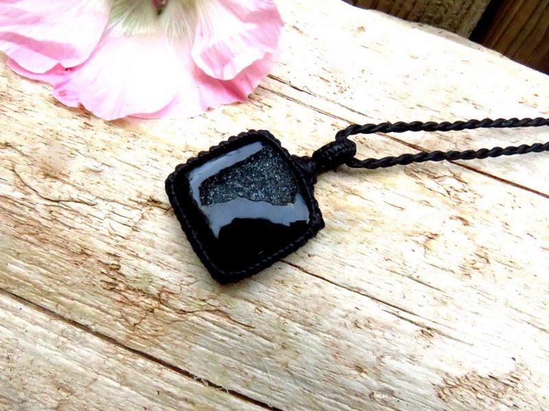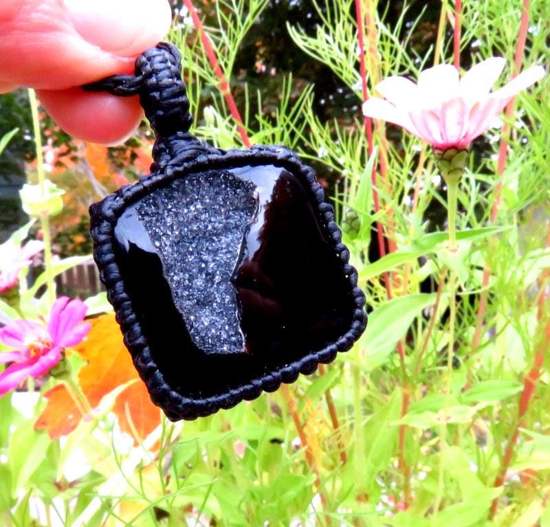 Beautiful black Onyx Druzy macramé necklace - Jet black with a sparkling gray druzy cavern - Druzy is a natural crystallization that occurs on a stone- tiny crystals formed through the heating and cooling process of Mother Earth. Exquisite !
