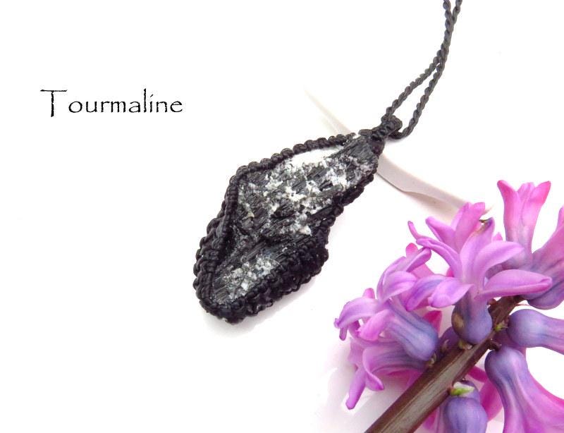 PROTECTION & POSITIVE ENERGY ⭐A stunning beauty ! Black Tourmaline crystal macrame necklace - jet black and sleek Tourmaline crystal (Schorl) with grayand white Mica inclusions - raw, natural shape . Gorgeous piece - don't miss it ! You will receive the exact crystal in photos #1-6 and the video 🖤