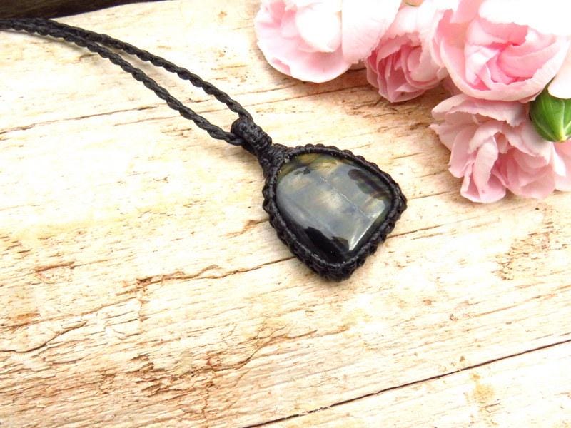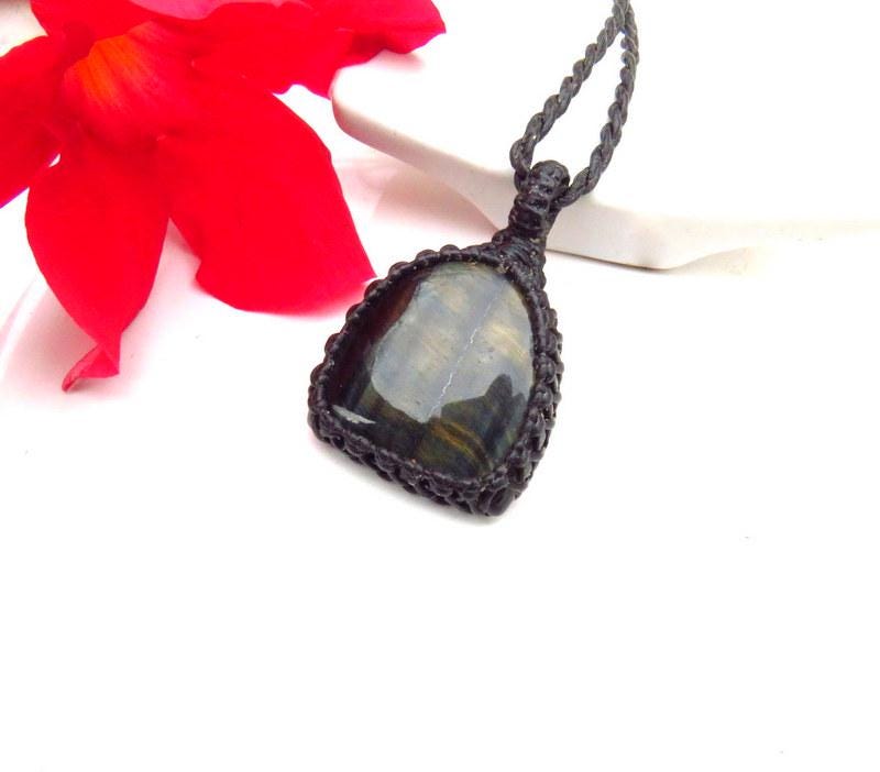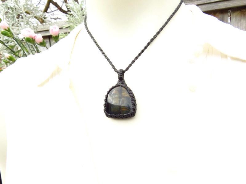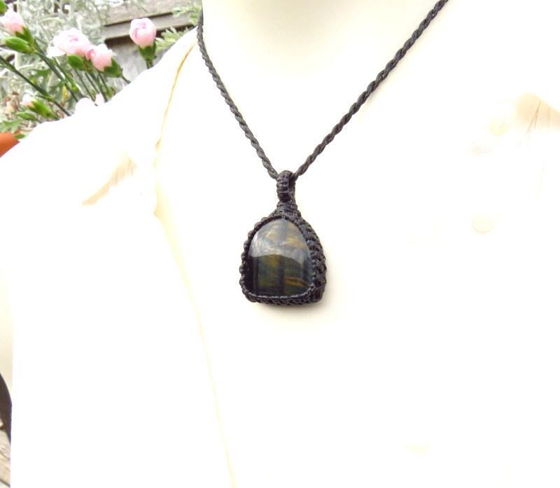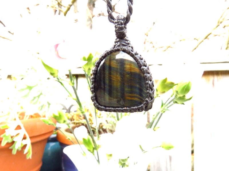 Lovely blue Tiger Eye macrame necklace - with pretty blue and gold chatoyance (flash)!
