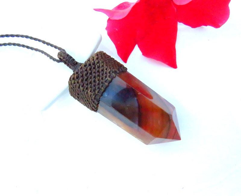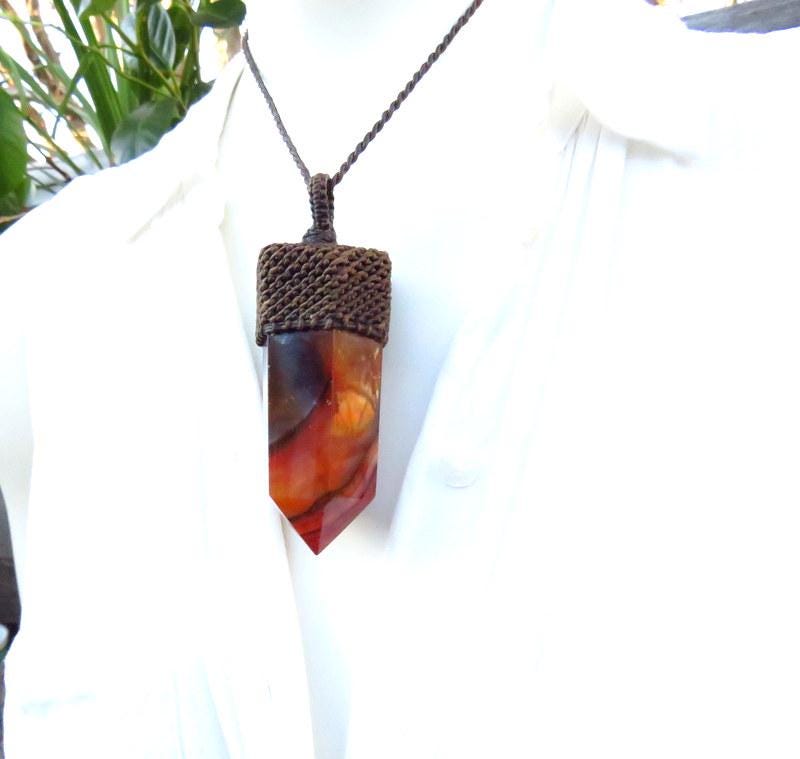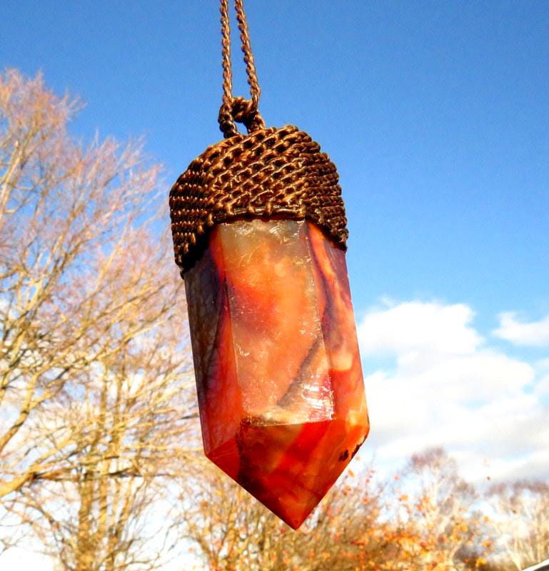 🧡COURAGE & MOTIVATION 🧡 Carnelian crystal point macrame necklace - a gorgeous mix of translucency and red and orange patterns and banding - gorgeous depth and dimension. Powerful , positive vibrations! Use carnelian to cleanse your space and energize your spirit. You will receive the exact piece in photos #1-7 and the video.