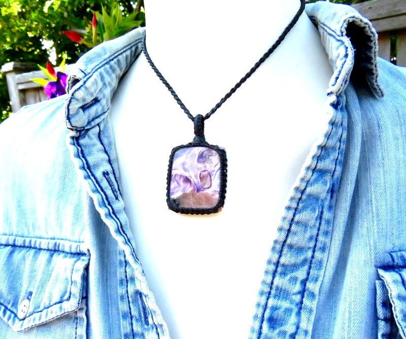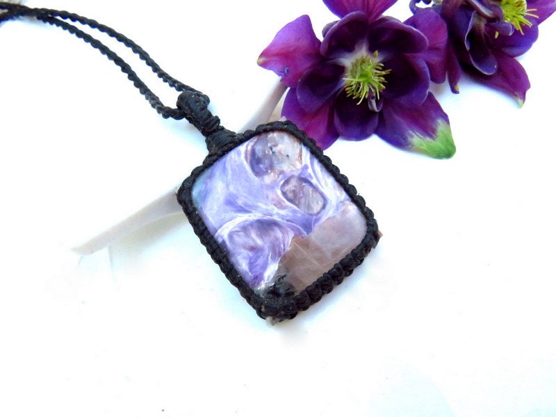 Materials: charoite, waxed cord, cabochon, semiprecious stones, gemstones.