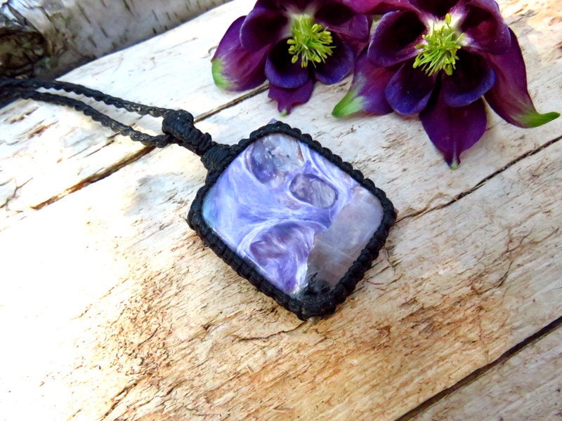 💜AS ONE DOOR CLOSES...ANOTHER OPENS 💜A beauty ! Russian Charoite Macrame Necklace - Intriguing colors and patterns - light and dark purple with a touch of chatoyance. A rare find ! This is an amazing piece to add to your gemstone collection! Only found in the Charo River area of Siberia - recently, the mining of Charoite has actually finished - which will make this beautiful stone more and more difficult to find!