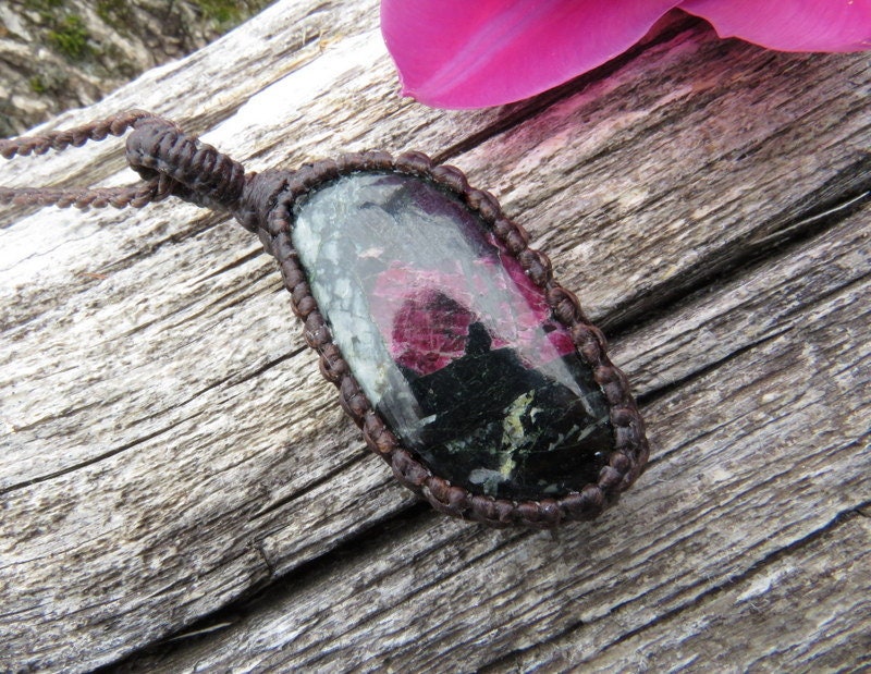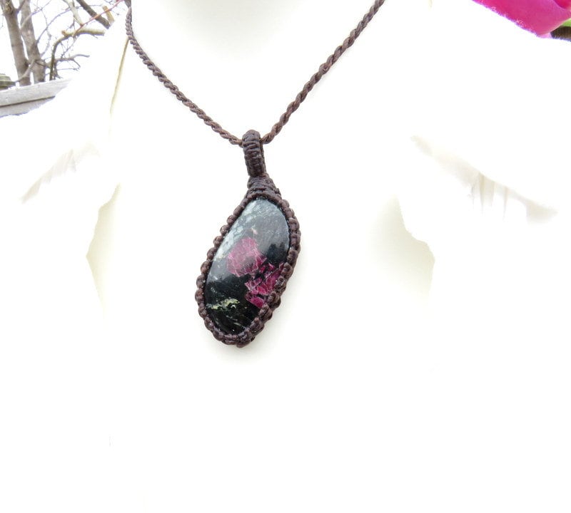 ✨Life Force & Love Force ✨ Rare and beautiful Eudialyte Macrame Necklace - unique colors and pattern - there are gemmy burgundy wine inclusions. Eudialyte was first discovered in Greenland and now found in a few other areas of the world such as Russia and Madagascar. Mineralogists at the Canadian Museum of Nature and the University of Copenhagen found out that as many as 46 different chemical elements could be part of Eudialyte’s crystal structure. Wow!! *Minor natural imperfections