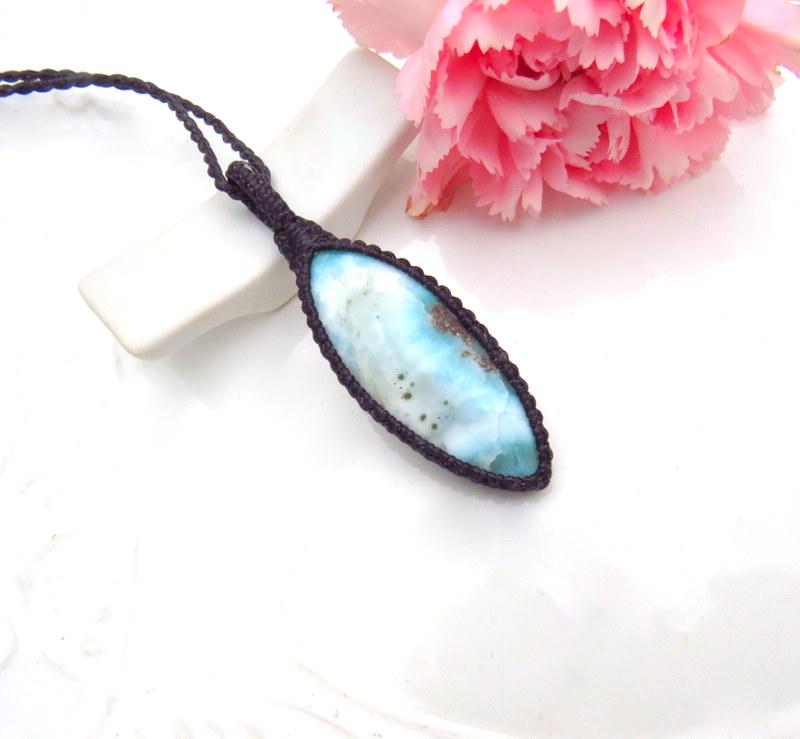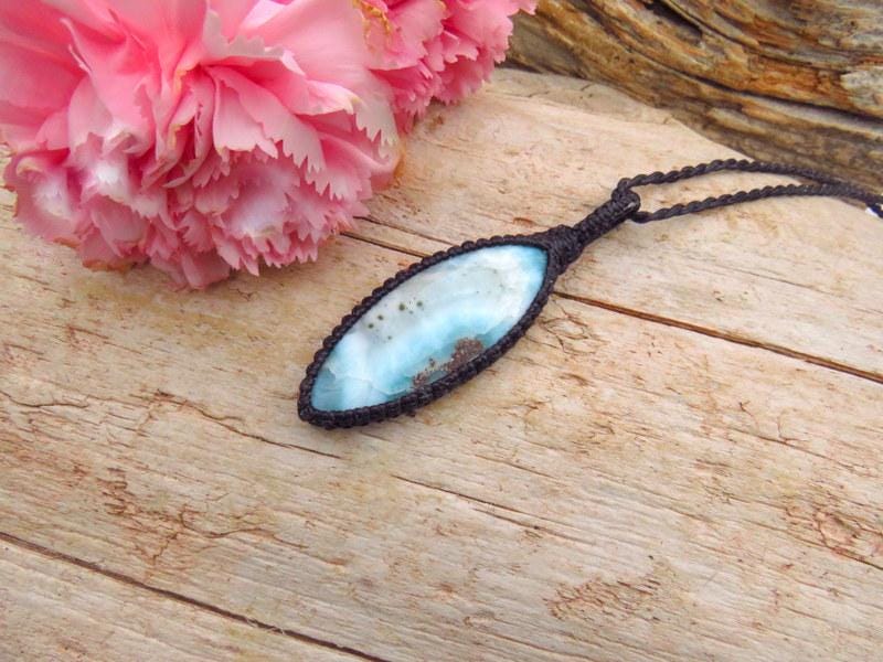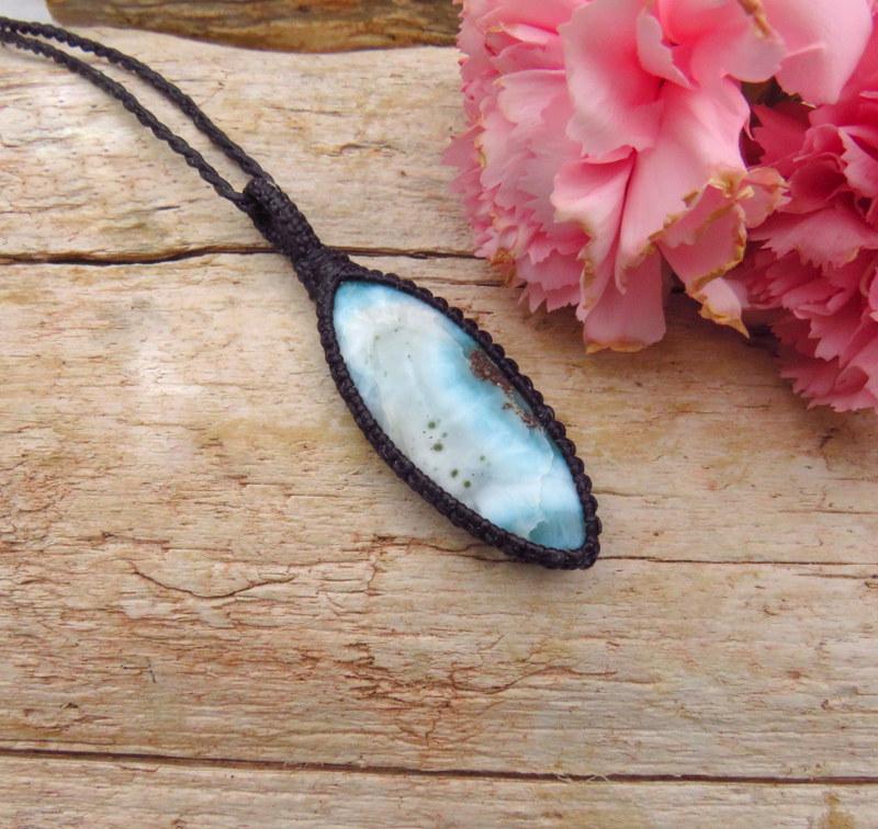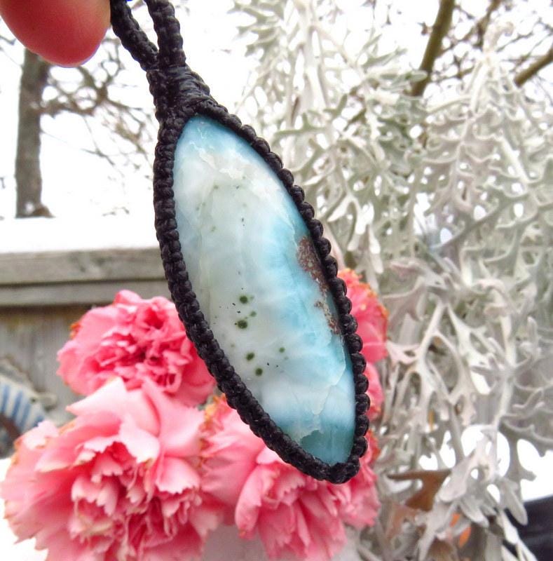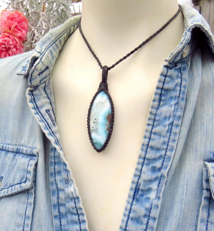🌊💙PEACE, LOVE & SERENITY 🌊💙 Quality Larimar macrame necklace - Reminiscent of a rippling Carribbean blue sea - Also known as the 'Dolphin Stone' - Besides its alluring color, Larimar is a also a powerful and energetic stone ! The price of Larimar reflects its rarity and how difficult it is to mine. Only found in the Dominican Republic and mined only by hand - in a very difficult area to access- Larimar is considered to be among the rarest gemstones in the world. Psychic Edgar Cayce (1877 - 1945). predicted that on one of the Caribbean islands a blue stone would be found with extraordinary healing attributes and it is believed that Larimar is the stone that Cayce was speaking of.