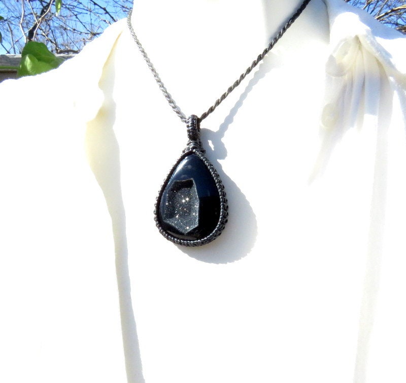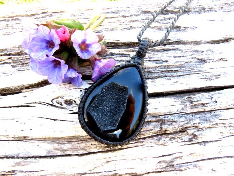 Beautiful black Onyx Druzy macramé necklace - Jet black with a gorgeous twinkling druzy cavern! Druzy is a natural crystallization that occurs on a stone- tiny crystals formed through the heating and cooling process of Mother Earth. Exquisite find! You will receive the exact piece in photos #1-6 and the video. All of our Healing Stones include a description of their healing properties ✨