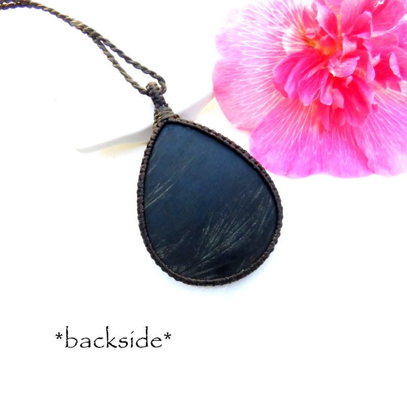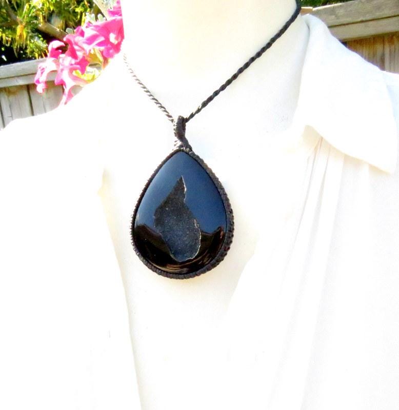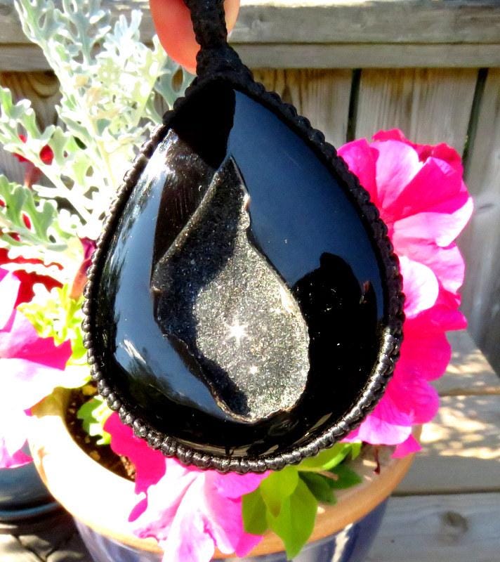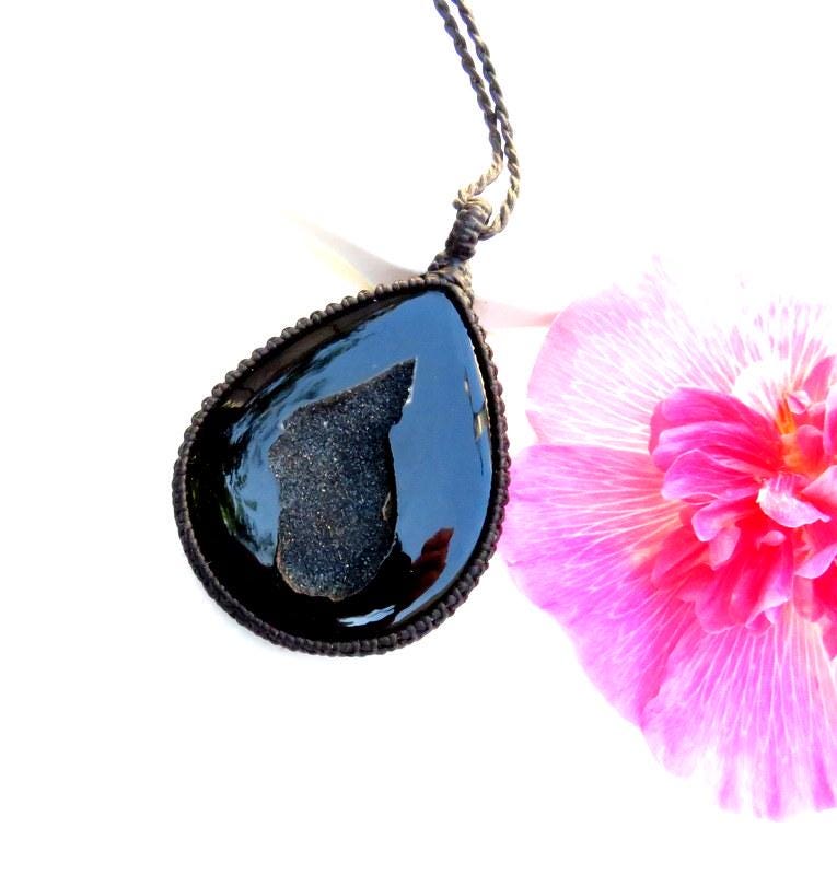 Gorgeous, extra large black Onyx druzy macrame necklace - Jet black with a sparkling druzy cavern - Druzy is a natural crystallization that occurs on a stone- tiny crystals formed through the heating and cooling process of Mother Earth. There is far more twinkle than our camera captured !🖤🖤🖤