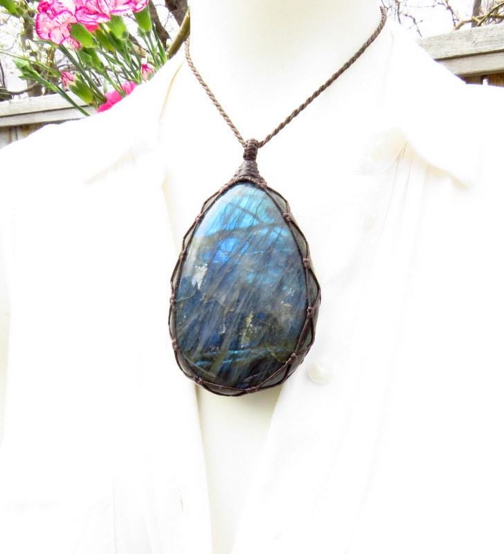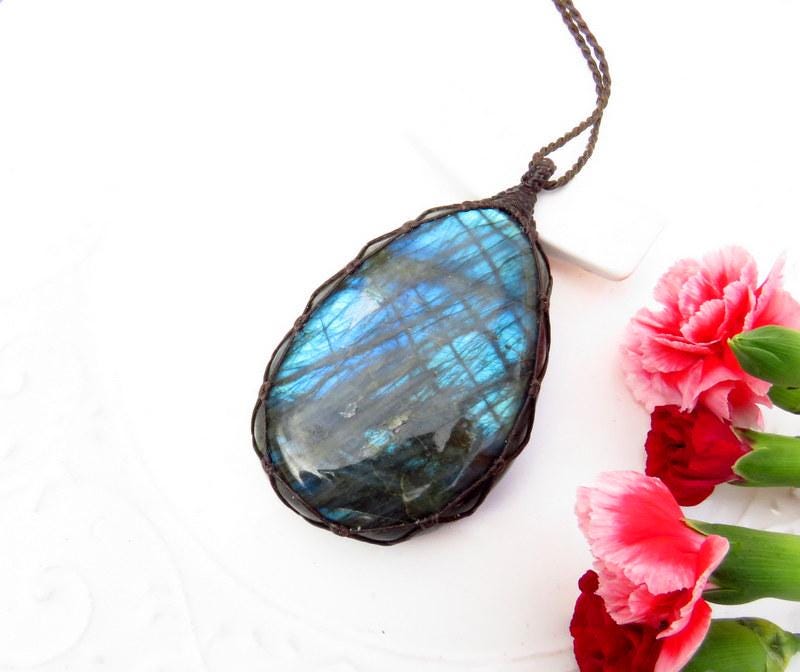 Lovely Labradorite macrame necklace - bold, fiery flash of electric blue and green with unique patterns - Gorgeous, oval palm stone shape and a very generous size 💙