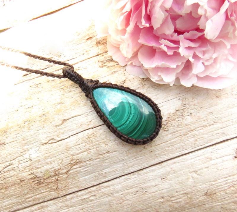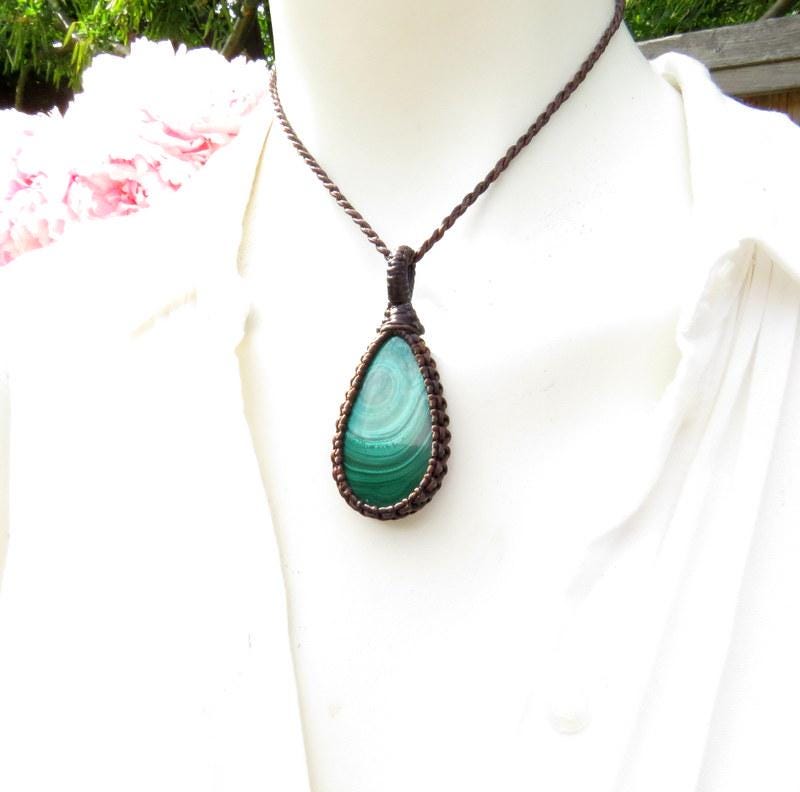Materials: malachite, cabochon, waxed cord, gemstone.