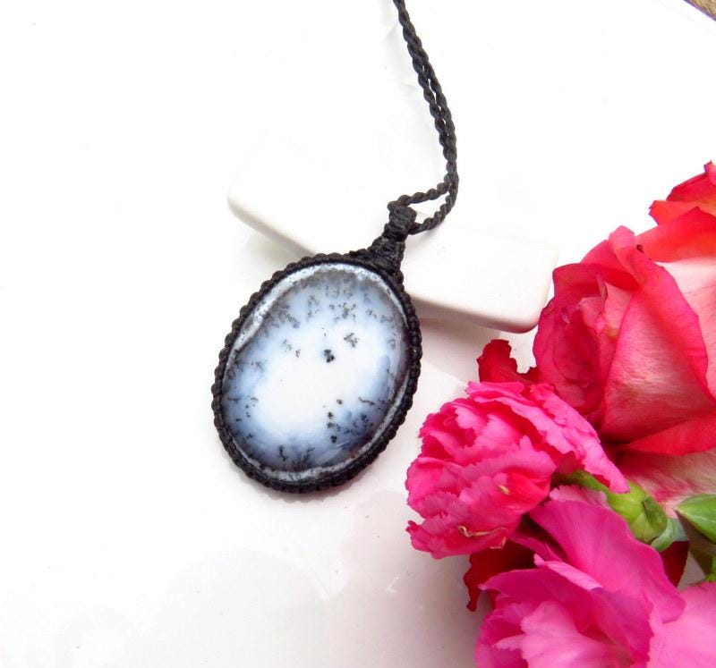 🌱GROWTH & CHANGE 🍂 A beautiful Merlinite Shaman (or, Dendrite Opal) macrame necklace - You will receive the exact piece in photos #1-7 and the video. Imagine a delicate slice of opal with these intricate, fern-like patterns that seem to dance across its surface - a whimsical forest scene, full of tiny, fantastical trees and leaves, all swirling in a delightful, organic chaos. These patterns, known as "dendrites," are actually mineral inclusions that have been cleverly disguised as delicate, ancient tree branches or delicate ferns. They turn each piece into a tiny, personal landscape, inviting you to get lost in its detail. Wearing Dendrite Opal is like carrying a miniature enchanted forest with you—a piece of Earth’s artistry that’s both playful and profound.