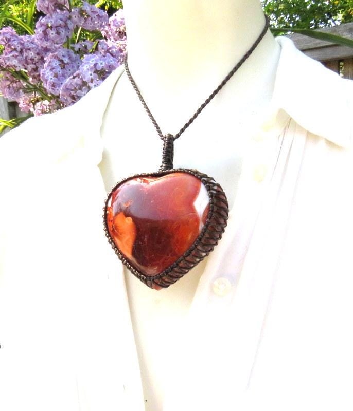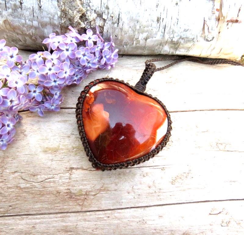 Beautiful, Carnelian Heart necklace🧡 This piece features a heart-shaped Carnelian gemstone that's not just any gemstone; it's a little bundle of fiery energy - like a pocket-sized sunset that got caught up in a gem. The shades range from deep orange to tantalizing red - making it a head-turner in every sense. Absolutely gorgeous front and back - reversible ! A statement piece. This precious gem is cozied up in a macramé setting - a meticulously hand-knotted tapestry of vibrant threads that cradle it with care. 🧡