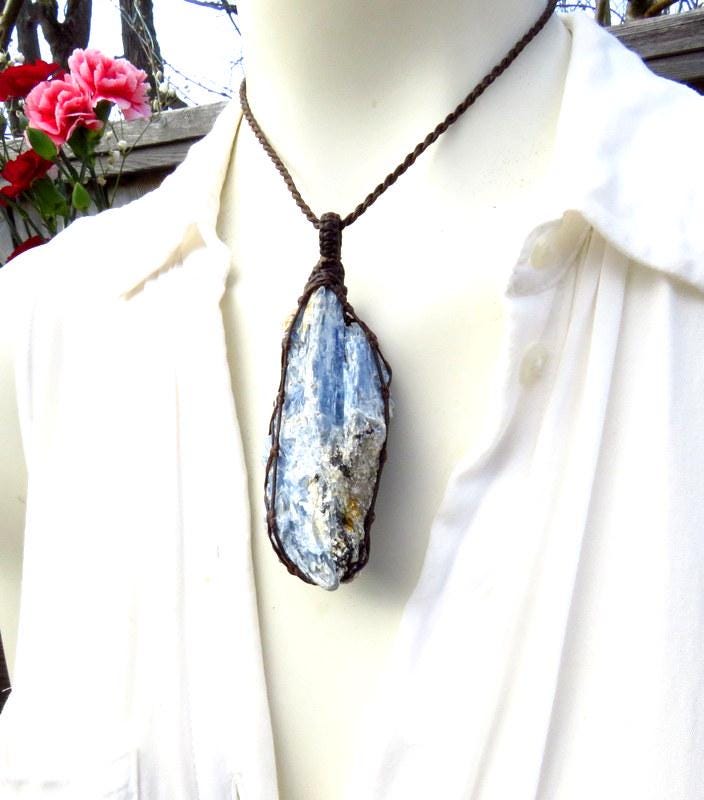 💙PEACE, CALM & POSITIVE ENERGY 💙Gorgeous, raw Kyanite crystal blade macramé necklace - from the Greek work 'kyanos' meaning deep blue - it is a lovely, serene blue with a beautiful flash (chatoyance) . Kyanite carries a strong positive charge - similar to rose quartz - and washes you with comforting vibrations -:) *Minor natural imperfections **You will receive the exact crystal in photos #2-7 and the video.