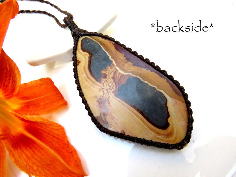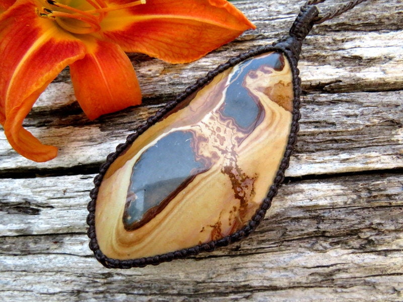 Spectacular Soldier Mountain Jasper macrame necklace - A collectors piece from Sevier County, Utah, USA. Defined lines, dramatic, scenic landscape. Creamy tan and smokey, dark blue. Generous size and unique - a rare and unique designer piece !