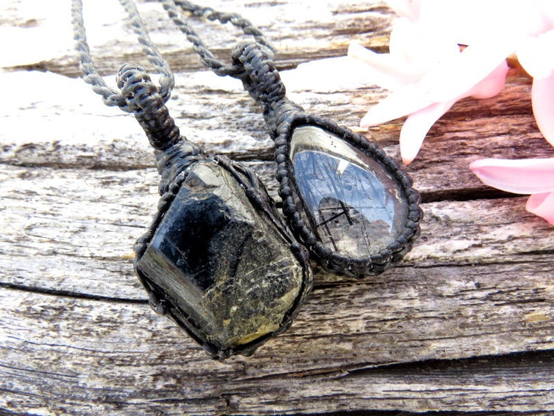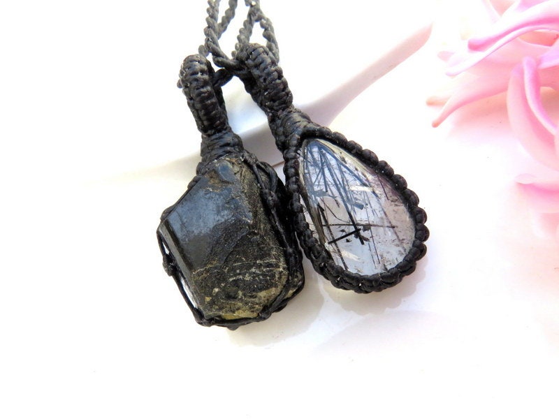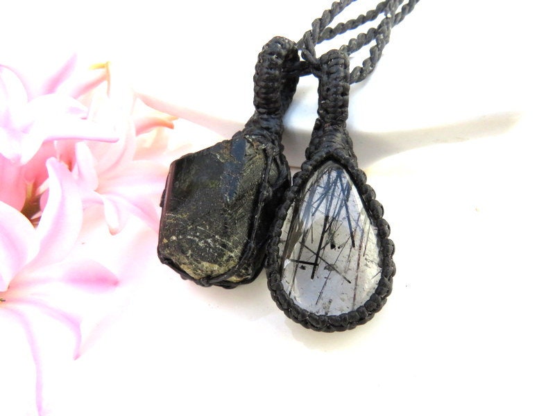 Beautiful Tourmalated Quartz & Black Tourmaline crystal necklace set - Tourmalated Quartz has captivating, bold inclusions of black Tourmaline in Quartz crystal and a sweet black Tourmaline crystal - very cool set ! These pairs can be worn stacked/layered together or worn separately - a lovely idea for best friends and soul-mates - and also a great size for kids! *You will receive BOTH (2) pieces with the cord length of your choosing for each (if you wish for different lengths, please indicate in the 'notes to seller' box in your cart or send us a message! ) *In the photos, we are showing the set with our 18 (16) inch cord and 22 (20) cord.